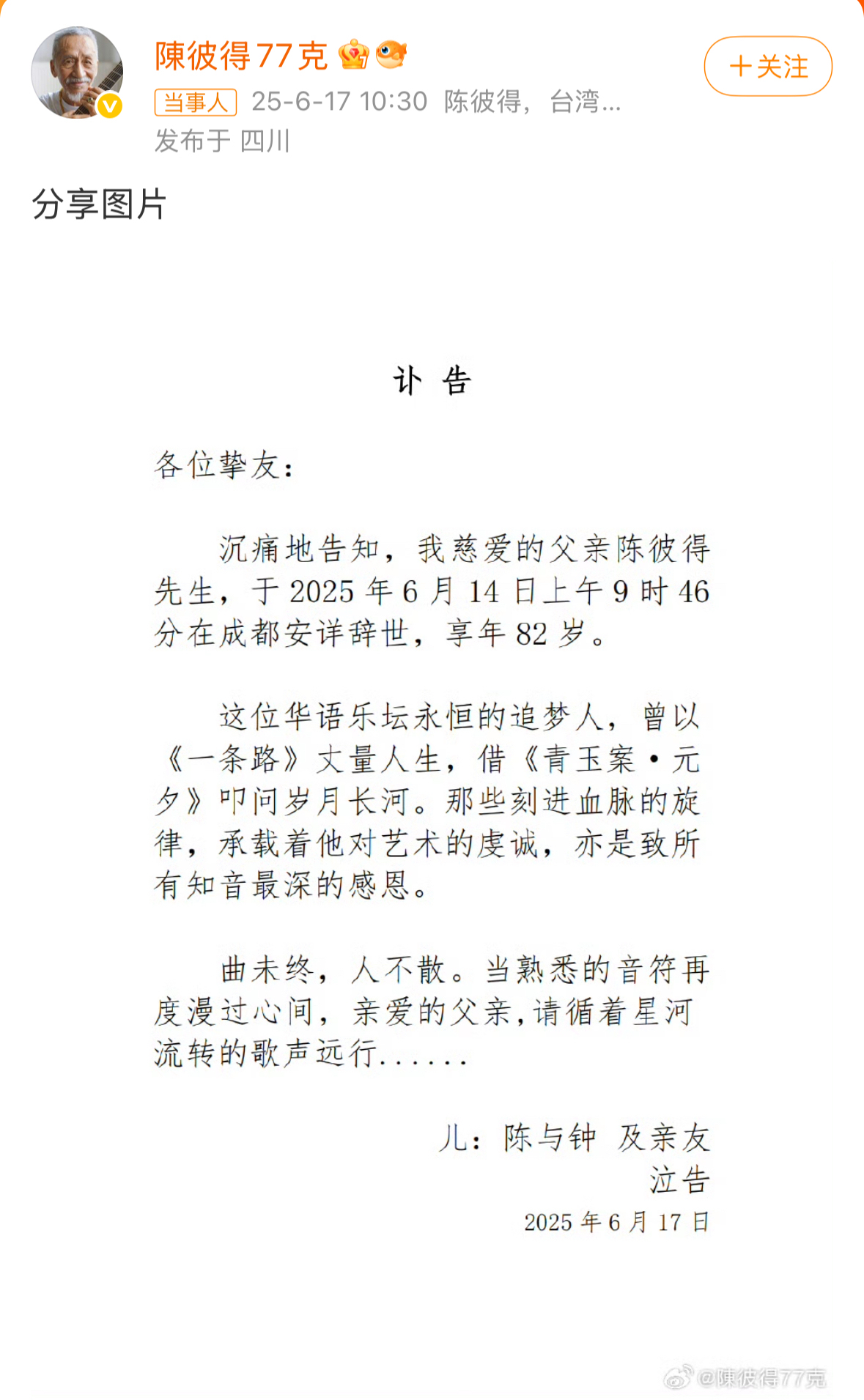 6月17日上午,华语乐坛泰斗陈彼得的家人发布讣告,称陈彼得先生于2025年6月14日上午9时46分在成都安详辞世,享年82岁。