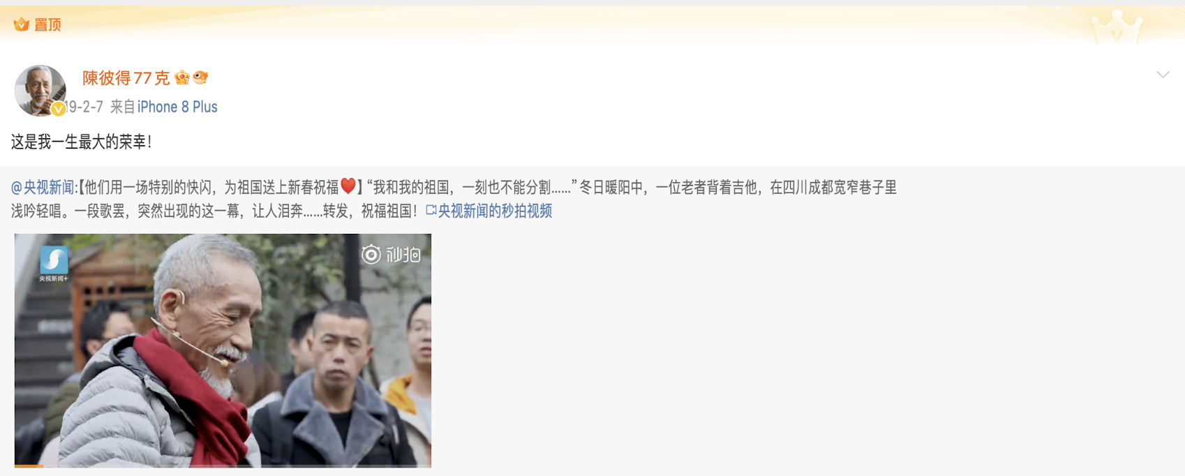 值得一提的是,2019年2月参与央视发起的快闪系列活动后,陈彼得在自己的微博中转发并置顶了活动视频,并配文称,“这是我一生最大的荣幸!”直至今日,这条微博仍是他的置顶。